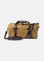 Small duffle taske fra Filson. Praktisk og holdbar duffle bag lavet af vandafvisende, slidstærkt Rugged Twill bomuld og førsteklasses italiensk okselæder. Designet er skabt som en kompakt, pålidelig rejsetaske, der opfylder flyselskabernes størrelsesbegrænsninger for håndbagage. Den rustfrie messinglynlås og lukning med stormklap giver ekstra beskyttelse mod vejret, hvilket gør denne alsidige taske fantastisk til overnatningsture af alle typer. Justerbar læderrem tillader at du kan bære tasken over skulderen eller cross-body, som en messenger-taske. Remmen kan fjernes, når du vil bære den i hånden.